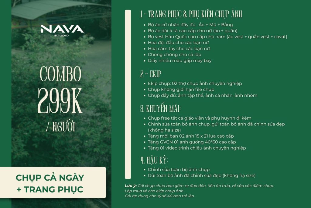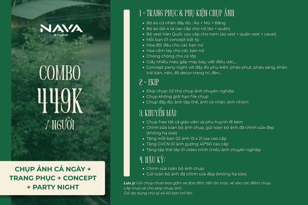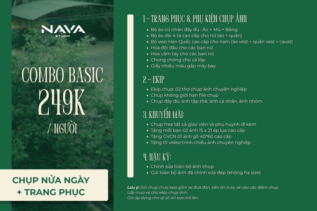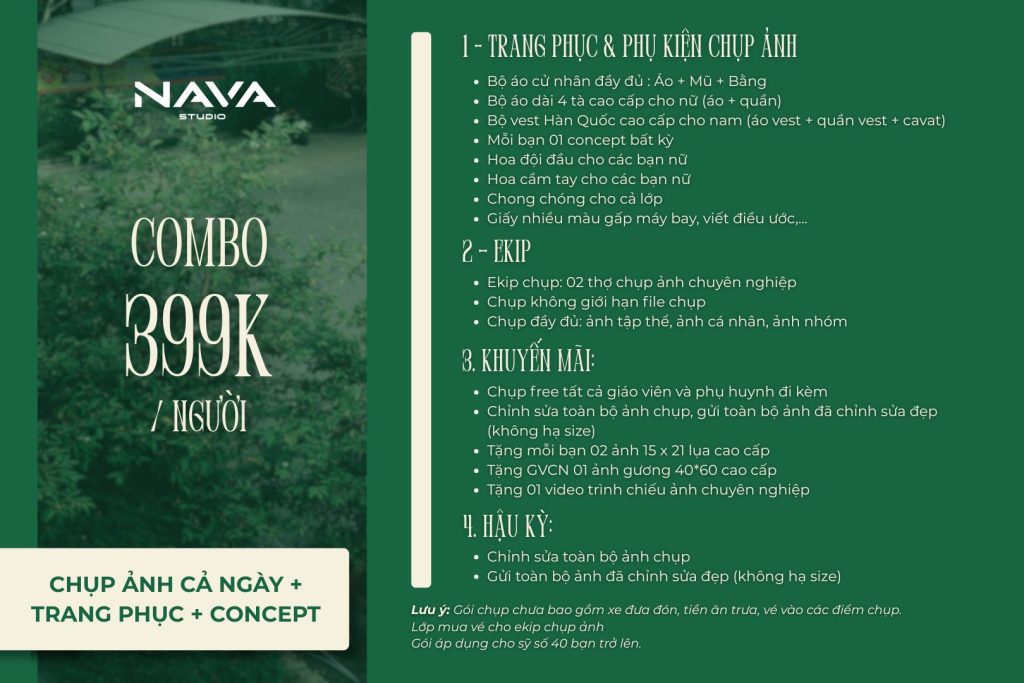 Dù lớp bạn chọn chụp tại sân trường thân quen hay lên ý tưởng cho một chuyến dã ngoại đáng nhớ, Nava Studio luôn có những gói dịch vụ linh hoạt – phù hợp với mọi concept, ngân sách và địa điểm khắp miền Bắc. Tham khảo bảng giá dưới đây để bắt đầu lên kế hoạch cho bộ ảnh thanh xuân của riêng bạn!